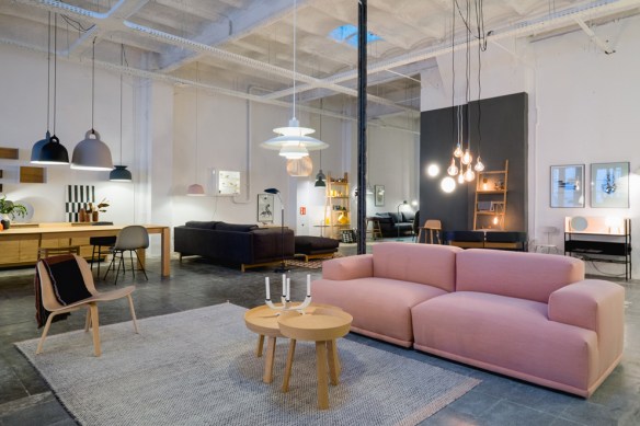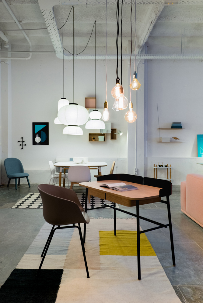 Detrás de una humilde puerta, entramos en el showroom de 300m2 que nos invita inmediatamente a sentirnos como en casa a pesar de encontranos en un espacio diáfano muy amplio y con techos muy altos. Los diferentes ambientes creados se interconectan de manera natural. Avanzamos poco a poco parándonos a menudo (eso si!) para mirar de más cerca esa lámpara de Ferm Living tan sencilla pero tan perfecta o para probar ese maravilloso sofa de Muuto de color rosa que nos llevaríamos a casa. Mobiliario y iluminación pero no sólo, los pequeños detalles tan importantes en la decoración escandinava, están allí. Os dejo con un primer vistazo al showroom, a ver si os animáis!